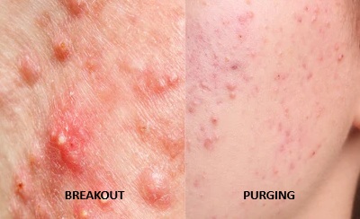 Beberapa orang sulit membedakan antara breakout dan purging. Keduanya merupakan hal yang berbeda. Purging adalah reaksi sementara akibat dari penggunaan produk yang mempercepat regenerasi sel kulit, biasanya timbul di area yang bermasalah sehingga ketika pemakaian nya dihentikan maka purging akan membaik sekitar 4-6 minggu. Sedangkan breakout adalah ketidakcocokan dari bahan yang dipakai atau kulit mengalami iritasi yang menyebabkan pori-pori tersumbat. Breakout cenderung terjadi dalam waktu lama jika produk yang mengiritasi tidak segera distop.